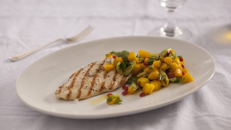 - Place a frying pan or griddle pan on a high heat and allow it to get hot, then add the chicken breasts and cook for about 2 minutes on each side or until the chicken is opaque all the way through. Remove from the pan and serve with the salsa and boiled rice or noodles.