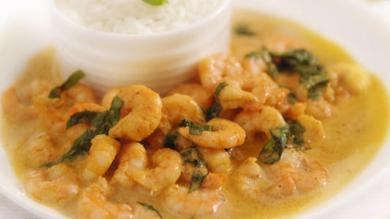 - Pour in the coconut milk and bring to the boil, then tip in the prawns and simmer for 3–5 minutes or until they become opaque and are cooked through.