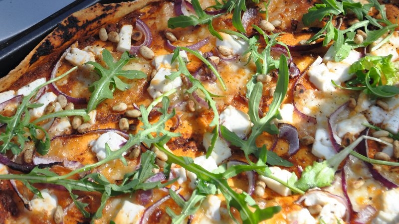 - Crispy bacon pieces, sliced mushrooms, jalapeno peppers, sliced peppers, sliced olives, pieces of cooked chicken or ham, red onion, sweetcorn, pesto, mozzarella, grated cheddar, dried herbs.
