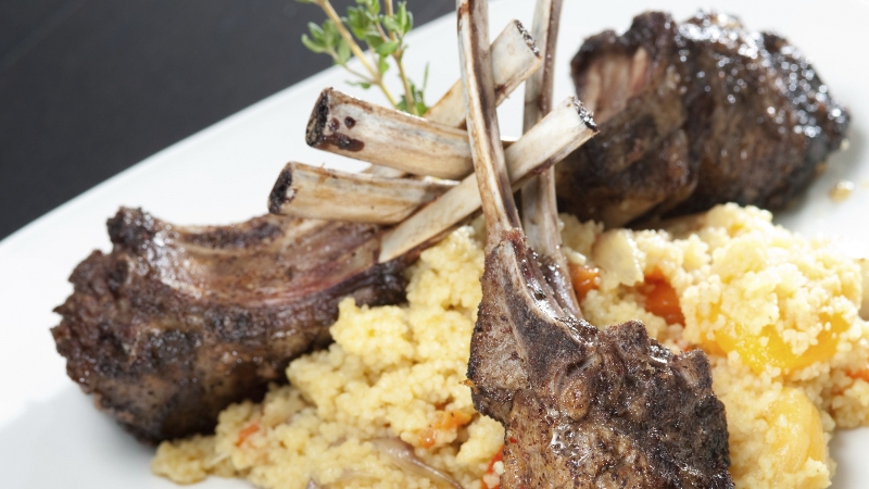 - Spoon the couscous on to warmed plates and arrange the lamb cutlets on top.