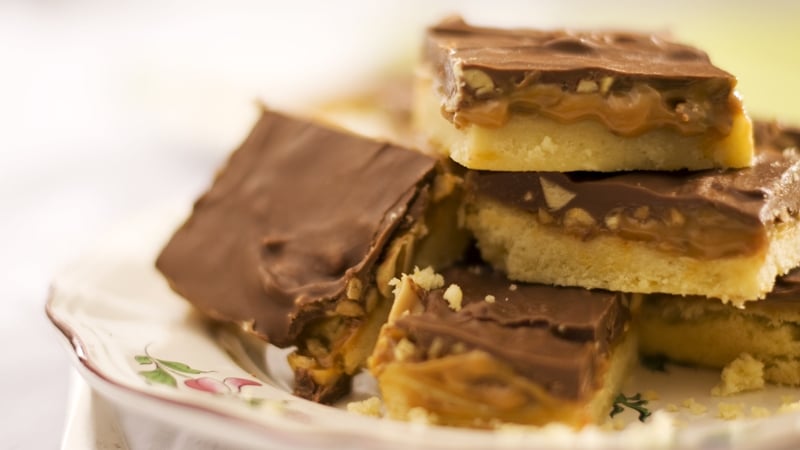 - Once it is cool, spread over the dulce de leche to cover the shortbread, then press the roughly chopped peanuts into it, making sure they are evenly distributed.