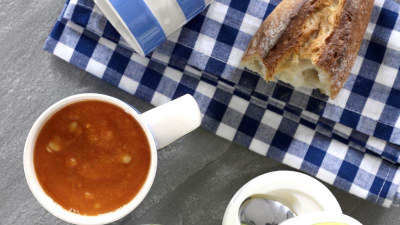 - Blitz with a handheld blender until smooth. Add the tin of chickpeas and heat through. If the soup is too thick for your liking, thin down with boiling water. Season to taste.
