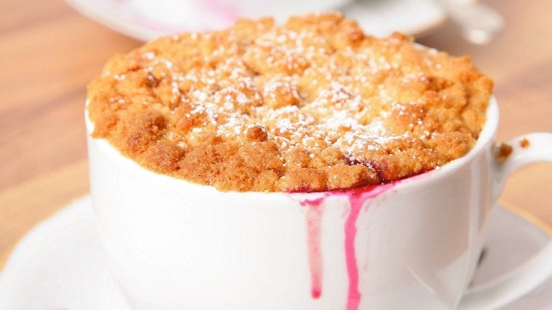 - Divide the fruit compote mixture between six oven-proof tea cups or small ramekins, filling them between half and two-thirds of the way up and topping with some of the crumble. (You may have some crumble topping left over that you can freeze for another time)