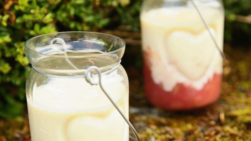 - Divide the rhubarb compote between the glasses or jars. Fill the chosen glass about a third of the way up and leave to rest.