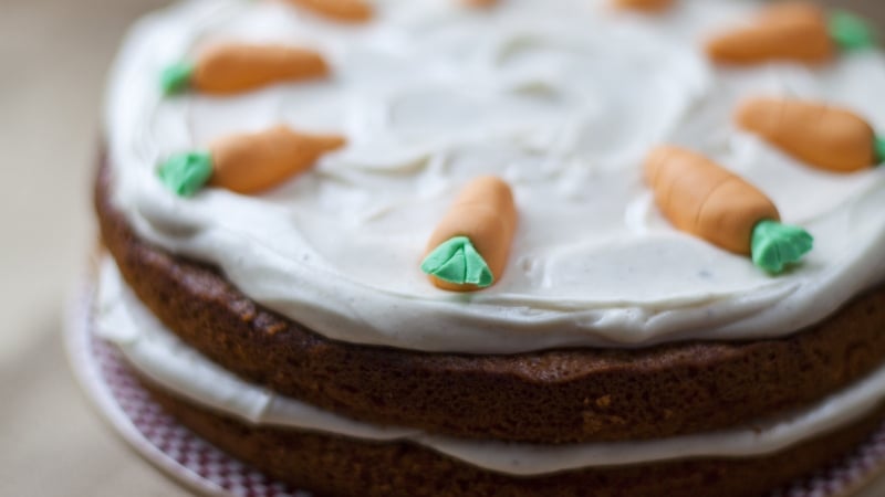 - Assemble the cake by spreading one of the layers with half the cream cheese frosting. Place the second layer on top and spread with the remaining frosting. Slice into eight slices and serve. The cake will keep in the fridge for 3–5 days.