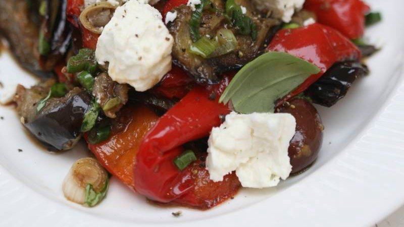 - Remove the skin from the pepper, cut into strips and roughly chop the aubergine and squeeze the garlic from their skins. Toss into the dressing with any roasting juices, the scallions, olives and basil. Season to taste.