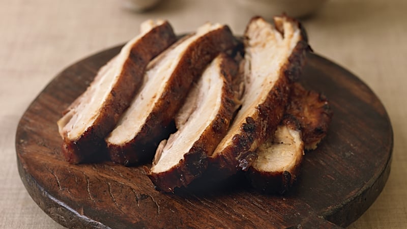 - Mix together the honey and soy sauce and pour the mixture over the pork. It will run down and off the pork, but don’t worry about it. Place the pork in the oven and roast for 20–30 minutes, turning often and basting with the glaze to achieve a glossy lacquered look.