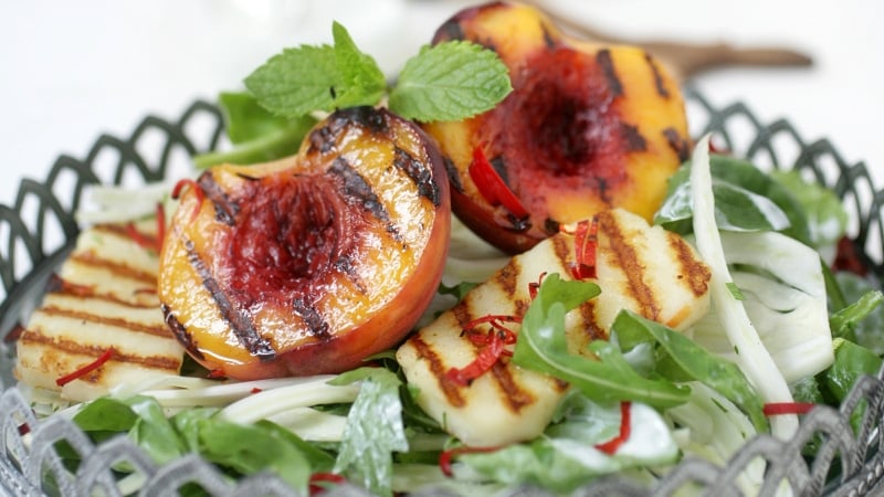 - Nestle the peaches on the bed of greens, add the halloumi cheese and scatter over the chillies and extra mint.