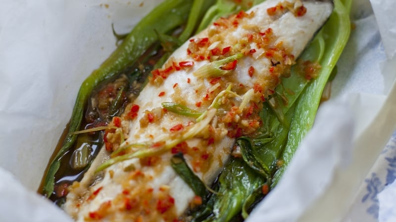 - Arrange the bok choy on the parchment sheets and top each with a sea bass fillet, some spring onion and chilli. Spoon the garlic and rice wine mixture over each fillet. Fold up the sides of the parchment paper and seal the corners with metal paper clips.