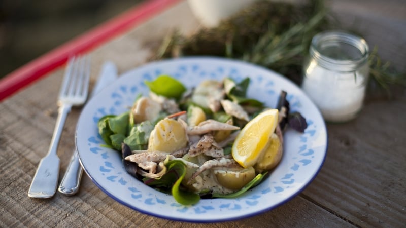 - Whisk together the oil, lemon juice and crème fraîche in a small bowl. Arrange the salad leaves on a large serving platter, place the potatoes on top and scatter with the smoked mackerel. Drizzle with the creamy dressing and serve straight away.