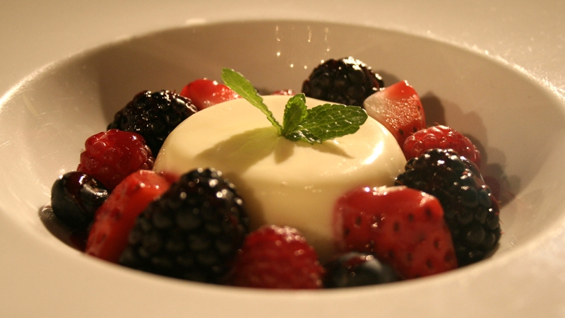 - To serve arrange the berries around outside of serving bowl, place the Panna Cotta in the middle and pour over some raspberry coulis. Garnish with some small mint leaves.