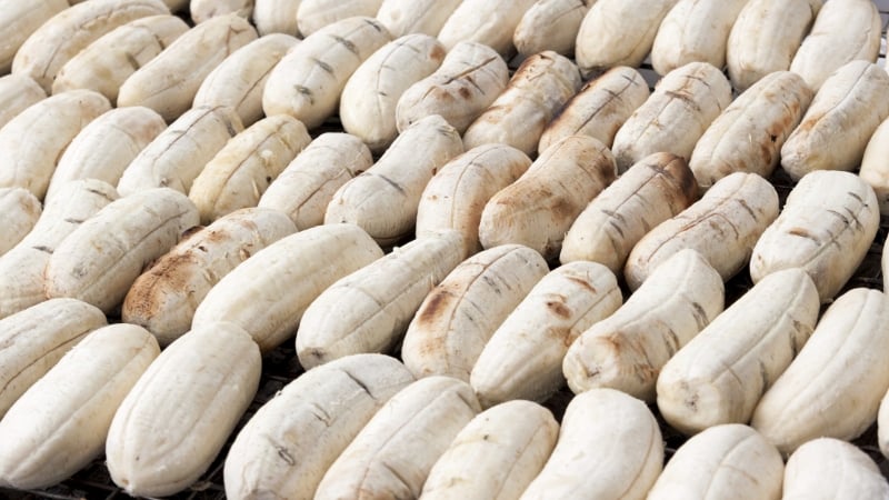 - Peel back just one side of the banana but do not pull it off completely. Cut into the banana flesh width ways so as to allow the chocolate buttons fit between each cut. Take care not to cut all the way through and not to put too much chocolate. Return the peel into place and wrap the banana in foil ready to go on the BBQ