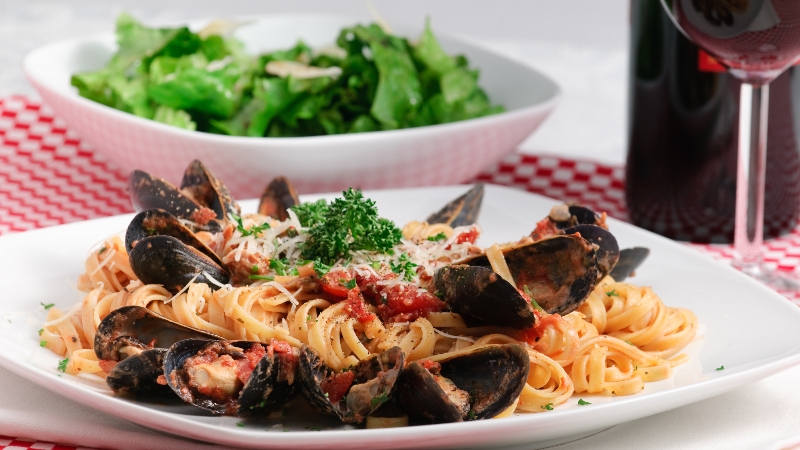- Drop the pasta in boiling water for 10 seconds and strain. Add to the mussels and toss.