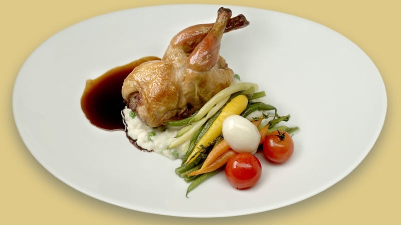 - For the pigeon jus: Strain the reserved juice into a muslin cloth and allow to boil gently. Add chicken stock and sherry vinegar to taste. Serve alongside the pigeon in a jug.