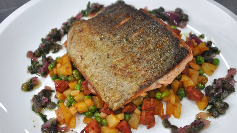 - Carefully turn the fish fillets over, then squeeze over the juice from one half of the lemon. Cook for 1 min more, basting fish with the lemony pan juices. Turn off the heat and leave the fish in the pan. Spoon a pile of the fricassée into the centre of each plate. Place another spoonful of the mixture on top to create a small heap. Gently sit the fish fillet on top, skin-side up.
