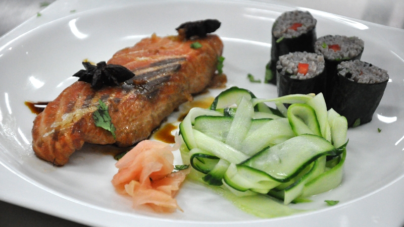 - Drizzle sweet soy sauce on the plate, place hot salmon on top. Lean the soba sushi against the side of the salmon and place the cucumber salad on top of the salmon.