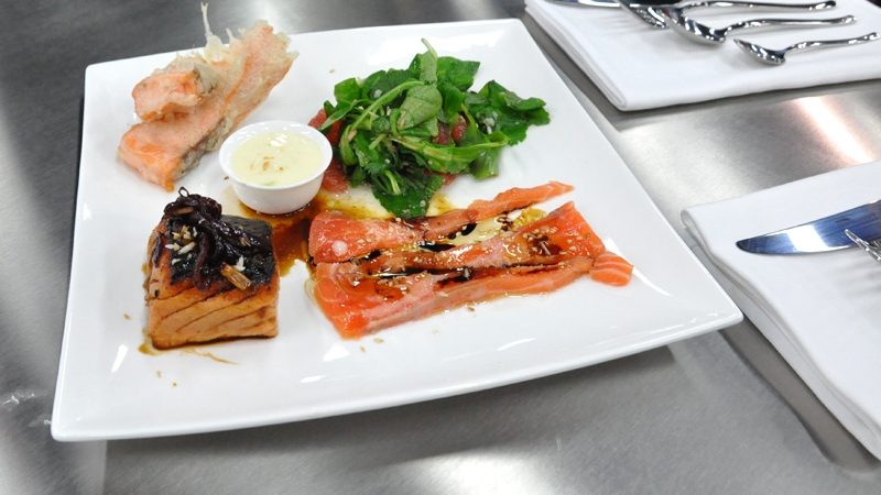 - Place tempura salmon on plate and top with the coconut and some of the onions and garlic