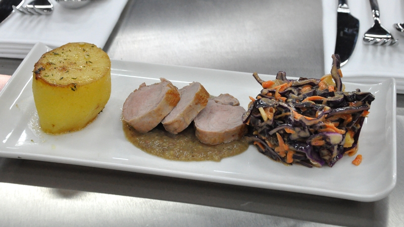 - To plate: Slice pork fillet and place on centre of plate, put chestnut sauce in the middle with coleslaw and potatoes on the side.
