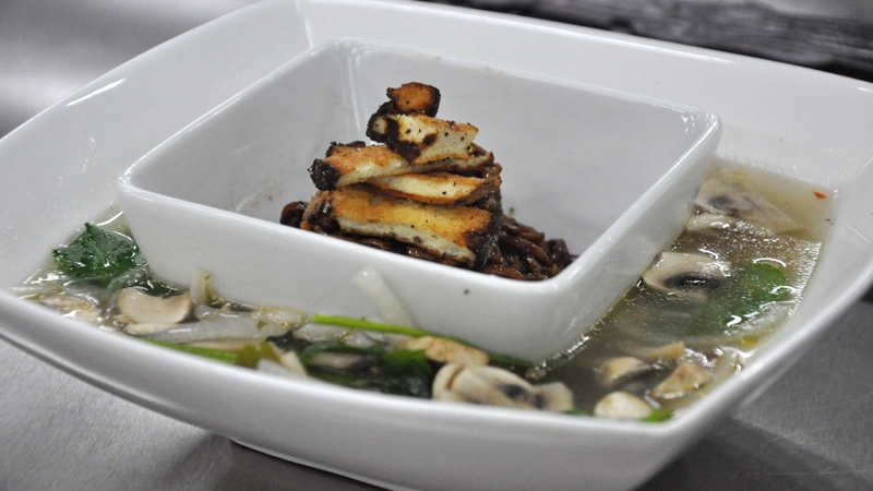 - Start to re-heat the remainder of the vegetable broth and season to taste.