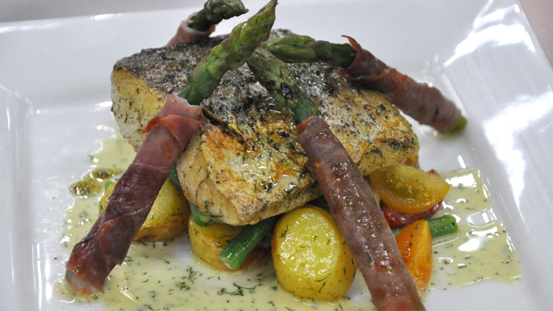 Served with a warm summer potato salad, chargrilled parma-wrapped asparagus spheres with a dill beurre blanc