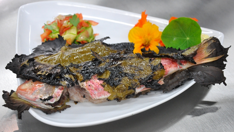 Wrapped in vine leaves with toasted citrus and Nasturtium flower aioli, served with a melange of summer vegetables