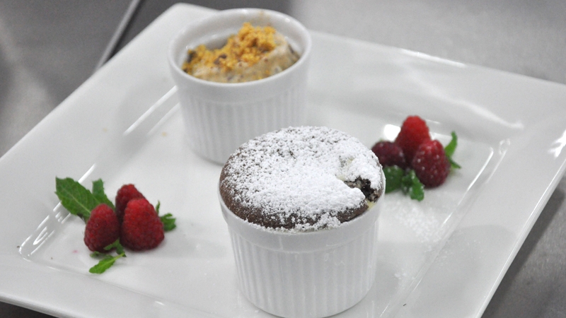 - Chocolate fondant: Melt chocolate and butter over pan with water.