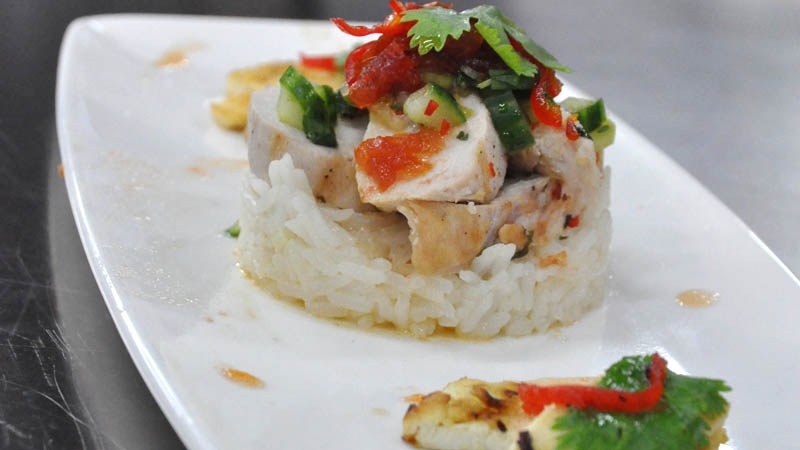 - Place the basmati rice in a mould in the center of the plate and add chicken slices in a circle on top. Pour the sweet chilli sauce on top and finish with the salad. Place the tofu on either side of the plate and pour a few drops of the sauce around the plate