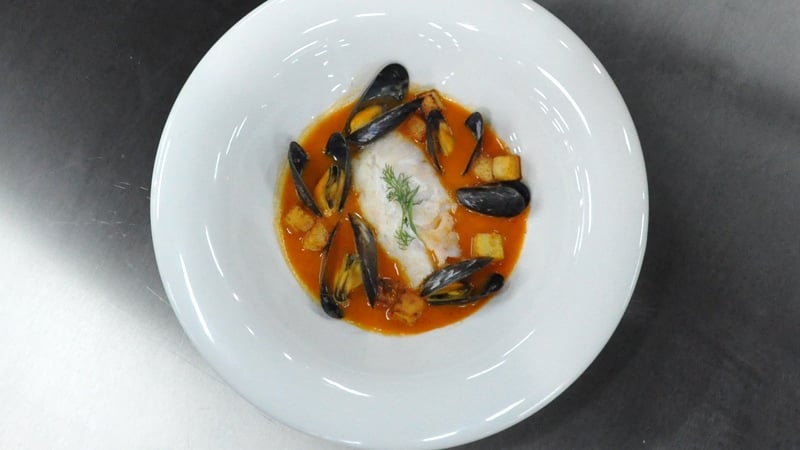 - Ladle sauce on plate. Add hake, potatoes and mussels.