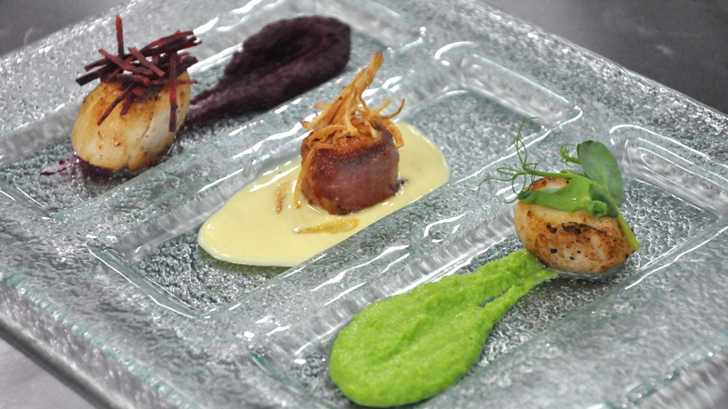- Scallops: Heat frying pan with a bit of oil, season scallops, 1 wrap with Parma ham and secure with cocktail sticks cook them in a hot pan 1 minute on each side at the end add in a few knobs of butter braise over scallops a few time. Leave to rest on the kitchen paper until ready to serve.