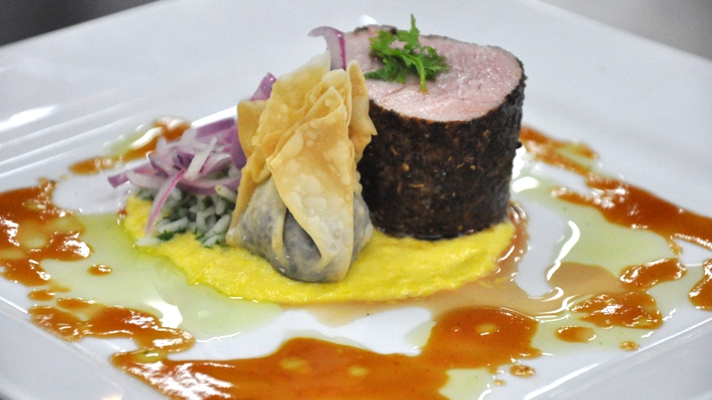 Served with Black Pudding Wonton, Coriander Rice, Sweetcorn Puree and Maple Whiskey Sauce