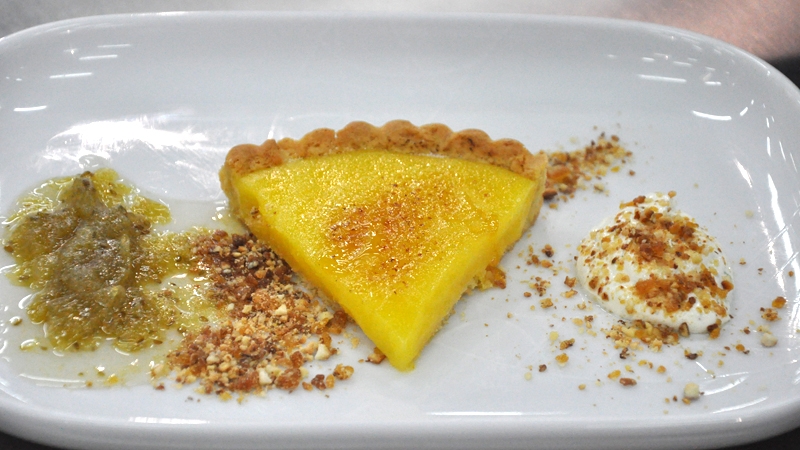 - Slice the lemon tart and place on the plate. Spoon the gooseberry sauce and crème fraiche onto the plate and cover with the praline mixture.