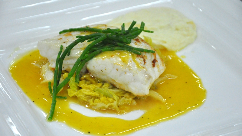 - To serve, reheat the buttered cabbage and celeriac puree to temperature. Place some of the buttered cabbage in the centre of a plate; place the turbot fillet on top of the cabbage. Place some of the celeriac puree next to the cabbage/turbot and spoon around the beurre blanc sauce.