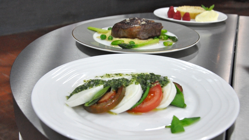 - Add some more oil to a small amount of pesto to thin out and drizzle around plate.