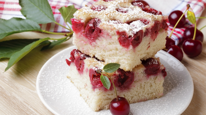 - Then add ½ cherry mix. Put into baking tray and sprinkle remaining cherries on top