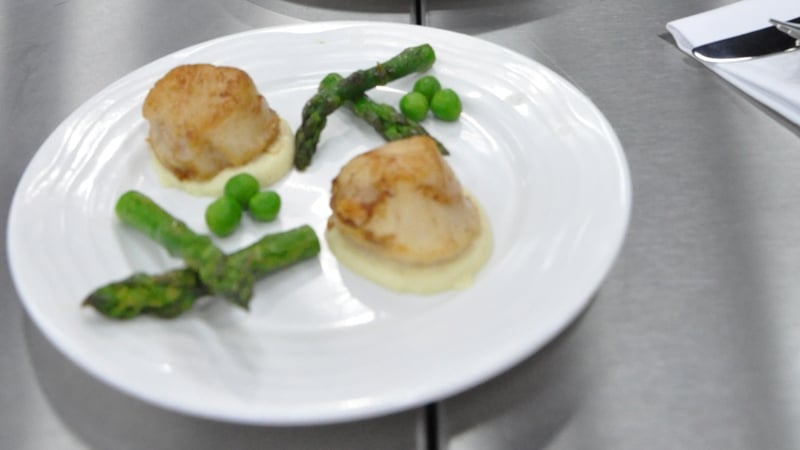 - Place 2 spoons of purée on the plate. Top with one scallop and asparagus spears on each side with couple of peas.