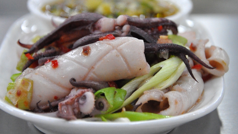 - Chop the spring onion, garlic and chilli and lightly cook in the same pan as the squid was cooked in making sure not to burn the garlic. Return squid to pan a toss lightly.