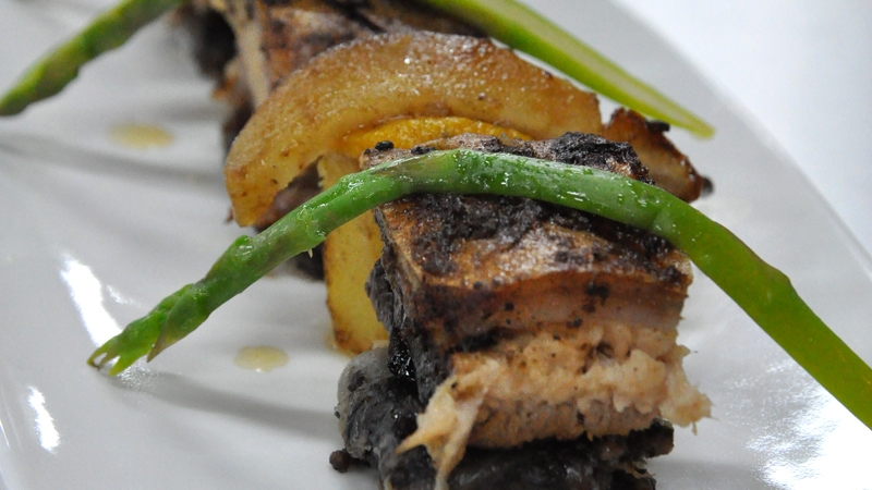 - Cut pudding into cubes. Build three towers with 1 and 2. In between place potato and spoon puree on top. Dress with butter cooked asparagus. Place jelly at either side.