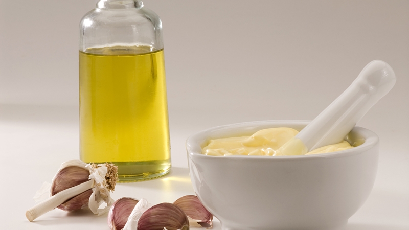 - Take a light whisk and beat together the egg yolks and crushed garlic with a little salt until thick.