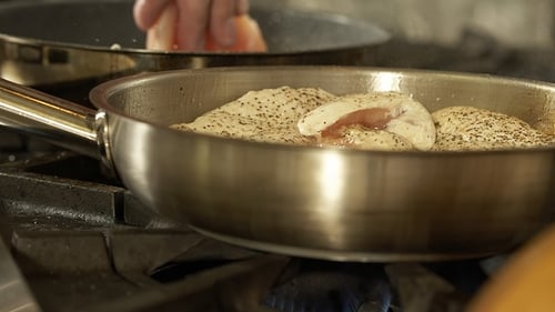 - Rub a little oil over the skin of each breast and, when the pan is good and hot, place the chicken pieces into the pan, skin side down and fry gently for about five minutes. Don't move the chicken in the pan at this stage.