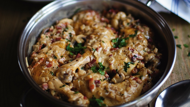 Coq au Vin Blanc was a regular winter dish in my house when we were growing up. I have distinct memories of it steaming up the kitchen windows while we did our homework on the kitchen table. It's a wonderfully warming meal, perfect for cold evenings. Chicken joints such as thighs and legs are often far cheaper to buy than chicken breasts, and meat cooked on the bone always seems to have more flavour.
