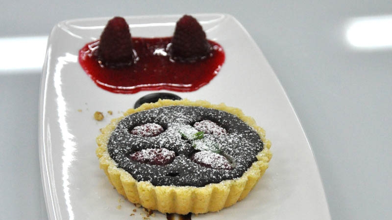 - Roll the pastry and put in mini tartlets. Blind bake for 10 minutes @ 190°C, brush with milk and bake for another 5 minutes. Fill with chocolate mix, add 4 half raspberries and cool at 140°C for 8 more minutes.