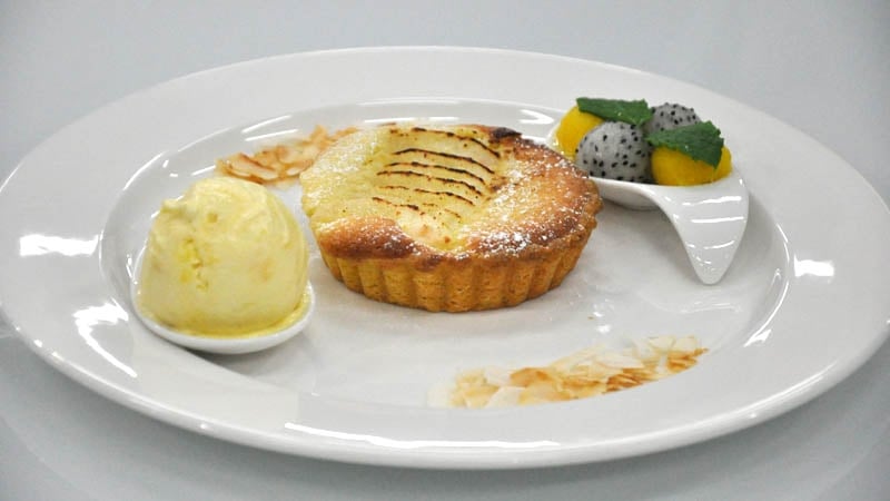- Roll out the pastry line in tart tin. Fill with frangipane. Top with sliced poached pear and bake for 30 minutes.