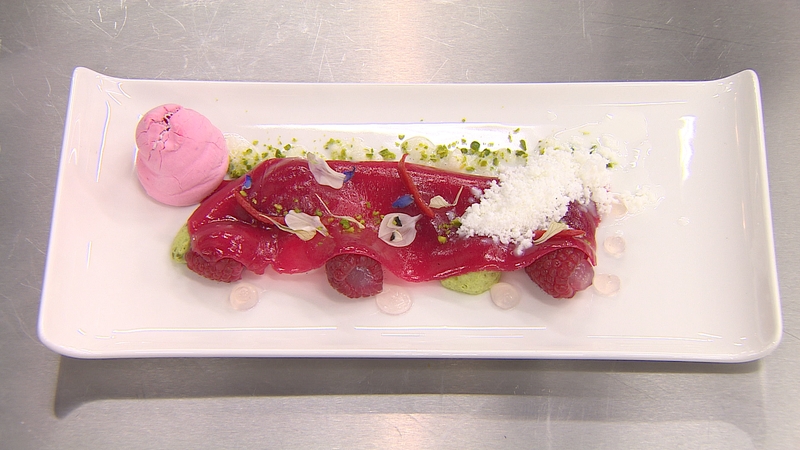 - In the final minute, prepare the frozen raspberry meringue. Foam ISI container jelly onto spoon and into a pan of liquid nitrogen, which forms the frozen meringue. Add your frozen meringue to side of plate.