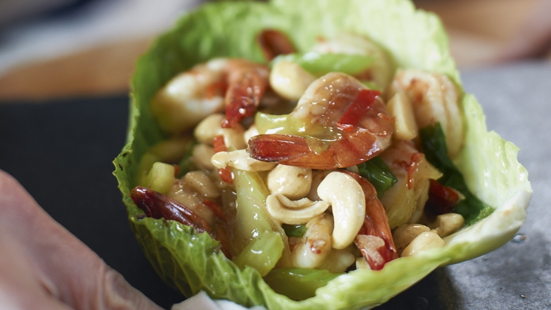 - Serve the prawns sprinkled with the remaining chopped chilli and a drizzle of sesame oil. If you like, you can use a large savoy cabbage leaf as a bowl.