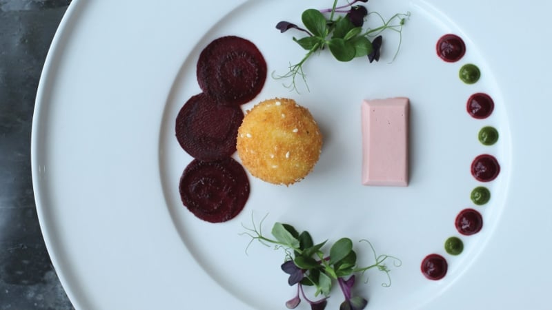 - To serve, dip the panna cotta moulds in just-boiled water for 5–10 seconds, then carefully invert the panna cotta onto the plates. Add 3 slices of the beetroot carpaccio to each plate. Put a dot of the beetroot purée on the plate to prevent the crispy goat’s cheese from slipping, then place on top. Garnish with the rest of the beetroot purée and the basil purée. Scatter over the affilia cress, pea shoots and mixed micro salad.