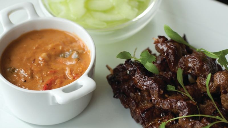 - Arrange the beef satay on warmed plates with small dishes of the pickled cucumber and satay sauce to the side of each one. Garnish with the micro coriander to serve.