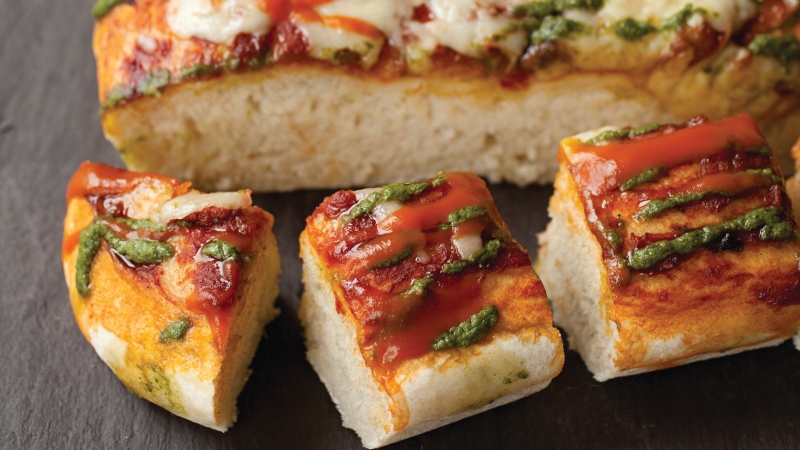 - To serve, cut the warm pizza bread into squares and arrange in a bread basket.