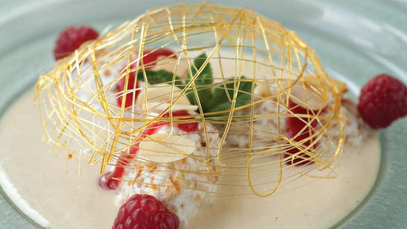 - To serve, pour the Coole Swan crème anglaise onto plates and carefully arrange 3 poached meringues on top. Sprinkle over the flaked almonds and drizzle with the raspberry purée. Carefully top each one with a spun sugar basket and decorate with the fresh raspberries and mint sprigs.