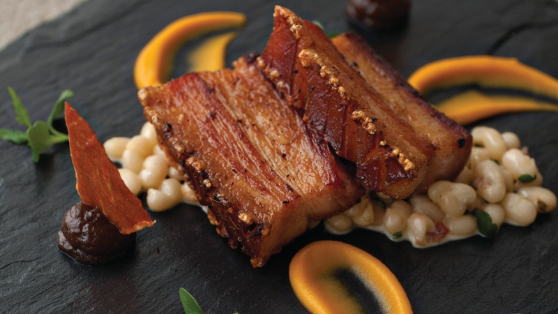 - To serve, spoon the creamed white beans into the centre of each warmed plate and place 2 pieces of crispy pork belly on top. Dot around some of the date jam, followed by smears of the sweet potato purée. Break the Parma ham into small pieces and use to garnish the date jam, then scatter around with the micro salad.