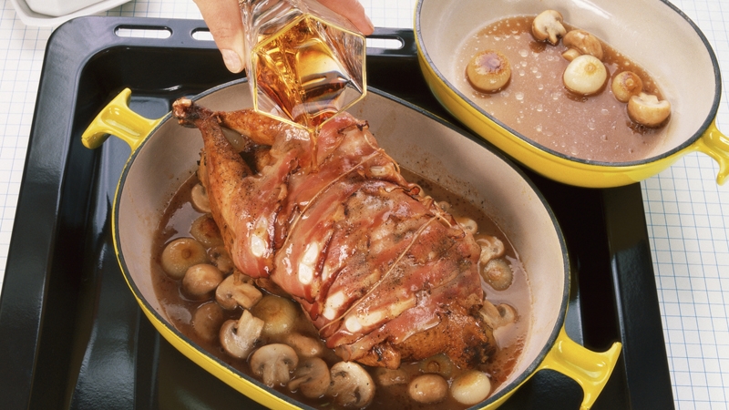 - Place the onions, garlic, stock and prepared chicken into the casserole and seal the lid with a strip of tin foil. Roast for 50- 65minutes